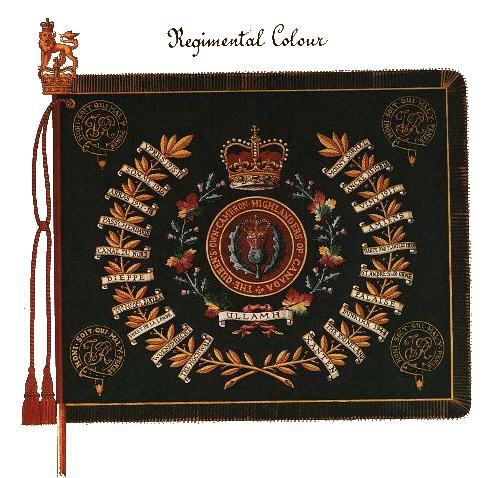 The figure of St. Andrew holding in his arms a Cross, enclosed by a wreath of thistles and leaves; across the lower part of the wreath are scrolls inscribed: QUEEN’S OWN CAMERON HIGHLANDERS OF CANADA.